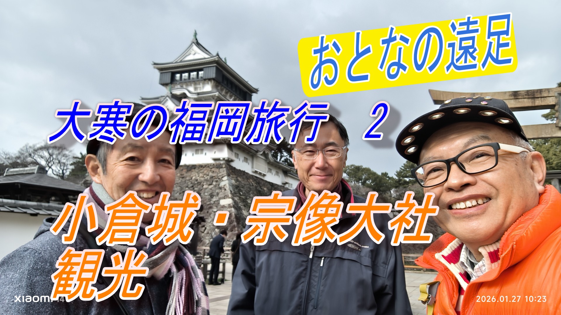 2026年1月26日から29日まで大寒の福岡を旅行しました。おとなの遠足チームの3名です。 二日目は小倉城を見て、東郷駅へ移動し、昼食を食べて、タクシーで宗像大社へ。沖ノ島から発掘された国宝8万点が保管される神宝館で、国宝をじっくり鑑賞しました。 夕食は水炊きをいただき、博多の食事を楽しみました。