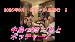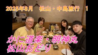 国内旅行 松山・中島旅行 1 2025年8月に松山に帰省し、中島の岡島家を訪問しました。その時のビデオをアップします。 最初は松山市内の様子を撮りました。その後、かに道楽、明神丸の食事風景、最後に松山踊りに遭遇したので、その動画を付けました。 ご笑覧ください。 2025.08.30 国内旅行